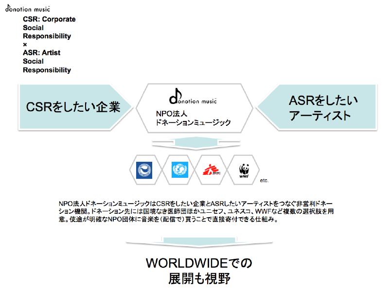 ドネーションミュージックの寄付分配システムを担うほか、企業や政府等に対して、日常のコミュニケーション(CMやテレビ番組など)にドネーションミュージックの採用を働きかけています。